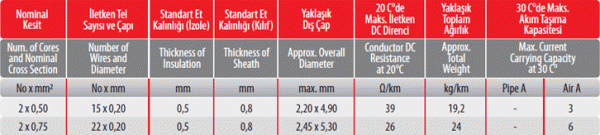 : Tip : H03VH-H (KORDON) Standartlar : TS 9760 IEC 227, VDE 0281-5, BS 6004 Yapısı : 1- İnce çok telli bakır iletken 2- PVC izole Kullanım Yerleri : Yassı olup, az mekanik zorlamalı ve kuru yerlerde kullanılan hareketli cihazlarda kullanılır. Teknik Bilgiler : Maks. çalışma sıcaklığı 70ºC Maks. kısa devre sıcaklığı 160ºC