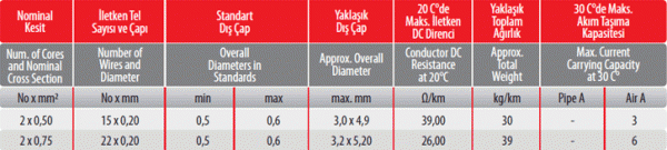 : Tip : H03VVH2-F (BALIK SIRTI) Standartlar : TS 9760 IEC 227, VDE 0281, BS 6500 Yapısı : 1- İnce çok telli bakır iletken 2- PVC izole 3- PVC Dış Kılıf Kullanım Yerleri : Yassı olup az mekanik zorlamalı ve rutubetli yerlerde kullanılan ev gereçlerinde kullanılır. Teknik Bilgiler : Maks. çalışma sıcaklığı 70ºC Maks. kısa devre sıcaklığı 160ºC