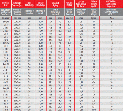 : Tip : H05VV-F (TTR) Standartlar : TS 9760 HD 21.5 S3, VDE 0281-5, BS 6500 Yapısı : 1- İnce çok telli bakır iletken 2- PVC izole, 3- PVC Dolgu, 4- PVC Dış Kılıf Kullanım Yerleri : Az mekanik zorlamalı kuru ve rutubetli yerlerde kullanılan ev gereçlerinde kullanılır. Teknik Bilgiler : Maks. çalışma sıcaklığı 70ºC Maks. kısa devre sıcaklığı 160ºC